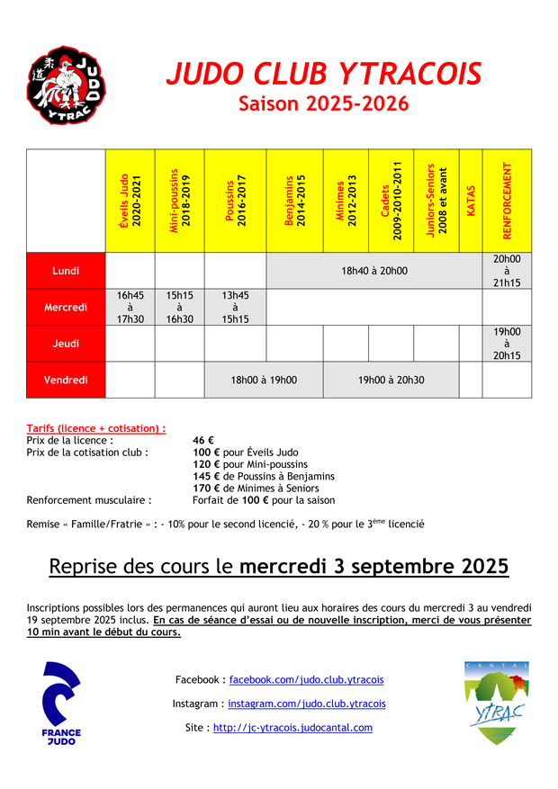 A l’approche de la reprise, qui se déroulera le mercredi 3 septembre 2025, nous vous invitons à découvrir les horaires et les tarifs de la saison 2025-2026. A noter qu’il n’y a aucune augmentation des tarifs des cotisations club pour cette saison.